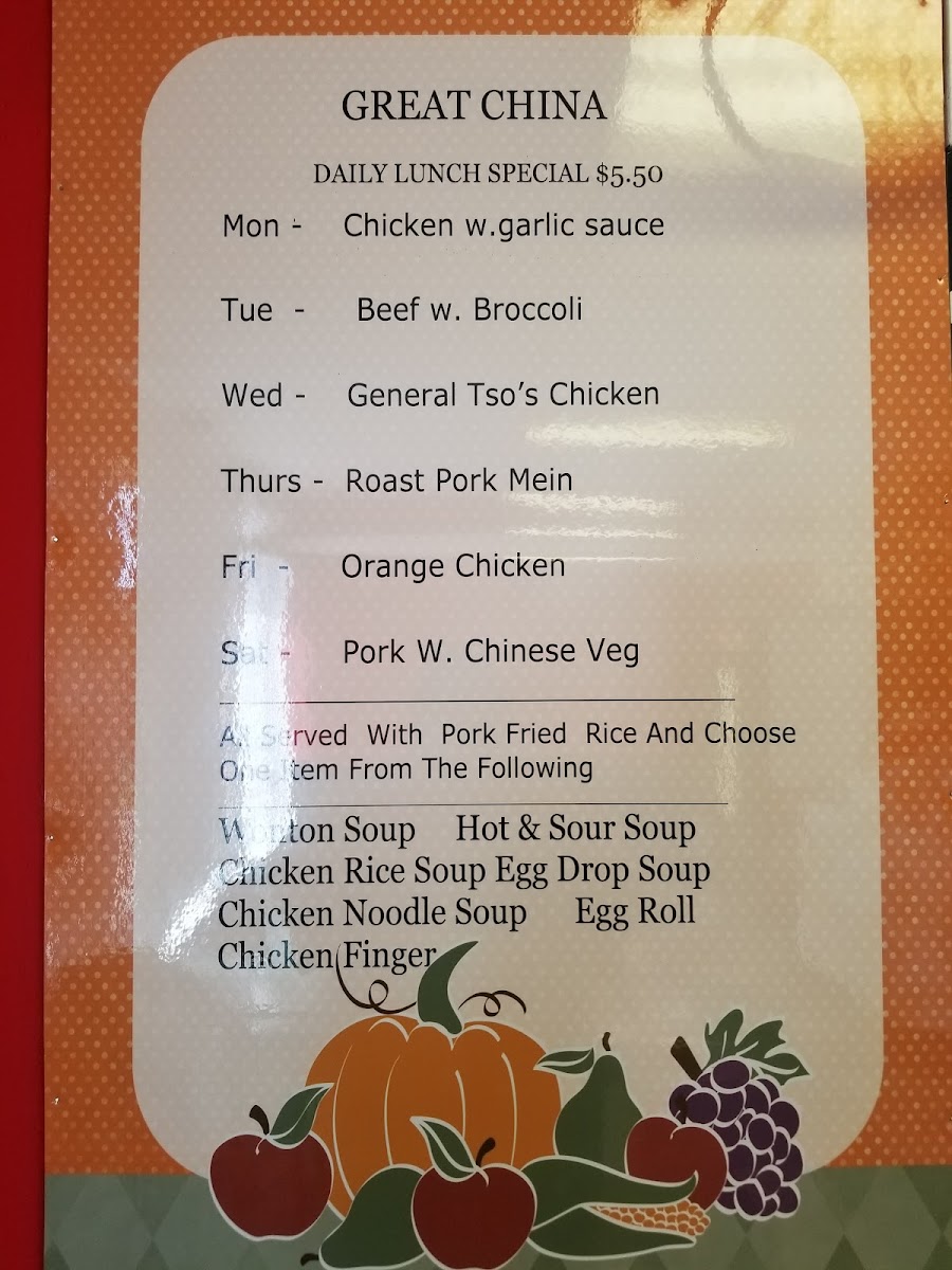 The menu’s combination of warm, home-style Chinese cuisine and convenient takeout or delivery options supports a simple yet reliable dining routine. Many appreciate the steady quality and timely service, making it easy to turn to Great China for familiar tastes and a comforting meal without fuss.